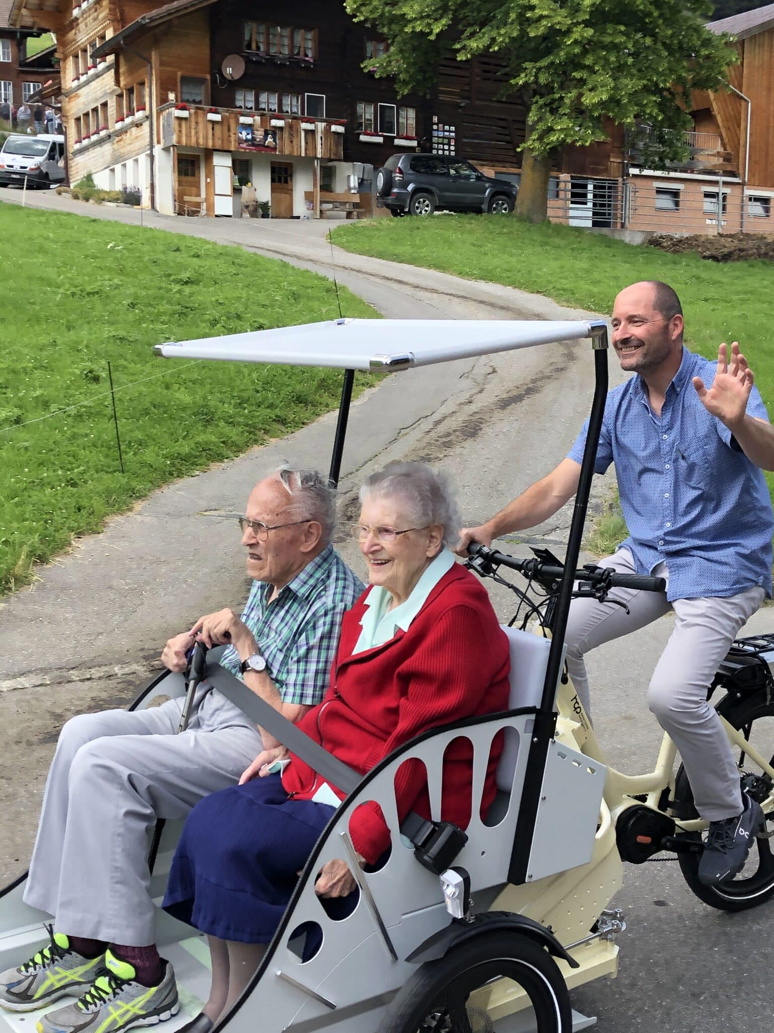 ADELBODEN Seit ein paar Tagen fährt ein ungewöhnliches, überdachtes Velo durch den Schwand und zieht viele Blicke auf sich. Beat Santschi und Kathrin Gempeler, die beiden Geschäftsleiter der Stiftung Lohner, haben die HeimbewohnerInnen mit einer Besonderheit überrascht.